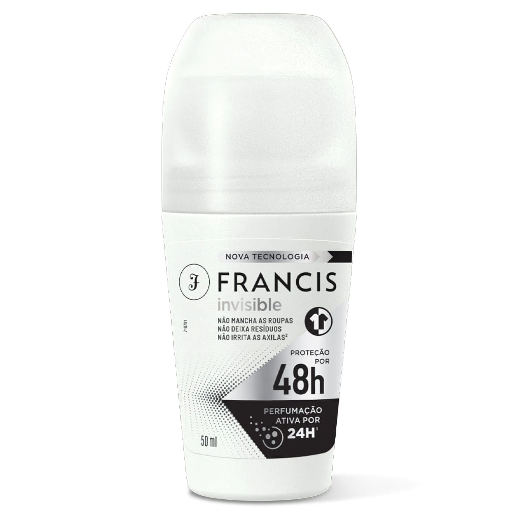 O Desodorante Roll On Francis Invisible 50ml foi especialmente desenvolvido com uma fórmula avançada, oferece proteção duradoura contra o odor e a umidade, proporcionando uma sensação de frescor e conforto. Oferece proteção contínua por até 48 horas, mesmo em momentos de alta atividade. Além disso, é formulado com ingredientes suaves e nutritivos, é ideal para todos os tipos de pele, incluindo as mais sensíveis. Sua textura leve e não pegajosa permite uma aplicação suave e rápida, sem deixar resíduos.