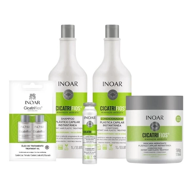Kit de tratamento para cabelos de todos os tipos, danificados. O Kit Inoar Cicatrifios hidrata intensivamente e diminui a queda, o frizz e o volume.