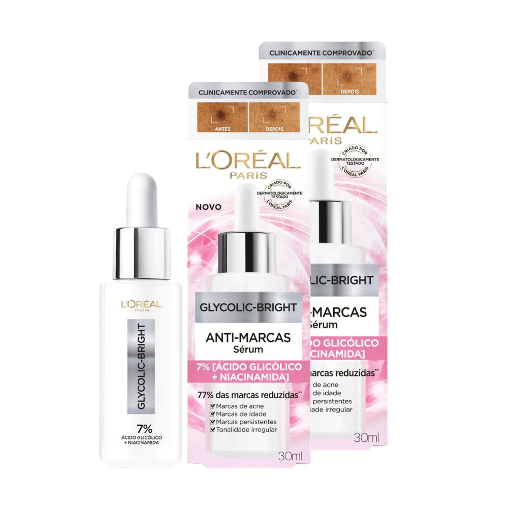 Glycolic Bright Anti Marcas Após anos de pesquisa, L’Oréal Paris apresenta sua mais potente fórmula para reduzir intensamente e rapidamente as marcas da pele. Com 5x ações corretivas, age na intensidade, opacidade, número, tamanho e recorrência, para uma pele com menos marcas de acne, marcas de idade, marcas persistentes, tonalidade irregular. Textura Sérum de rápida absorção, ideal para todos os tipos de pele, até as oleosas. Enriquecido com ingredientes altamente utilizados por dermatologistas para garantir uma pele mais uniforme, luminosa e com menos marcas. Respeita o tom da sua pele, agindo a favor do seu tom natural, não contra ele. Imediatamente: Textura da pele mais suave e hidratada Em 1 semana: Pele visivelmente mais radiante e luminosa [46%] das marcas reduzidas. Em 2 semanas: Tom e textura visivelmente mais uniformes. Melhora constante com [55%] das marcas reduzidas. Em 8 semanas: [77%] das marcas reduzidas. Age nas marcas persistentes. [92%] notaram uma pele mais bonita, jovem e saudável. Modo de usar: Utilizar a cada manhã/noite, aplicando 2-3 gotasno rosto e pescoçoevitando a área dos olhos. Para melhores resultados use o resto da gama. Composição: 936225 22 – INGREDIENTES: AQUA / WATER • CAPRYLYL METHICONE • VIACINAMIDE • ALCOHOL • BUTYLENE GLYCOL • GLYCERIN •HYDROXYETHYLPIPERAZINE ETHANE SULFONIC ACID • CAFFEINE • POTASSIUM HYDROXIDE • LINALOOL • GLYCOLIC ACID •2-MERCAPTONICOTINOYL GLYCINE • SODIUM THIOSULFATE • SODIUM HYALURONATE • PHENOXYETHANOL • AMMONIUM ACRYLOYLDIMETHYLTAURATE/VP COPOLYMER • CHLORPHENESIN • TOCOPHERYL ACETATE • POLOXAMER 338 • LIMONENE • TOCOPHEROL • HYDROXYACETOPHENONE • CAPRYLOYL SALICYLIC ACID • CITRONELLOL • TRISODIUM ETHYLENEDIAMINE DISUCCINATE • BIOSACCHARIDE GUM-1 •XANTHAN GUM • MENTHOXYPROPANEDIOL • BENZYL ALCOHOL • BENZYL SALICYLATE • PEG-12 DIMETHICONE/PPG-20 CROSSPOLYMER • Cl 17200 / RED 33 • Cl 42090 / BLUE 1 • PARFUM / FRAGRANCE (FIL: Y70041581/1)