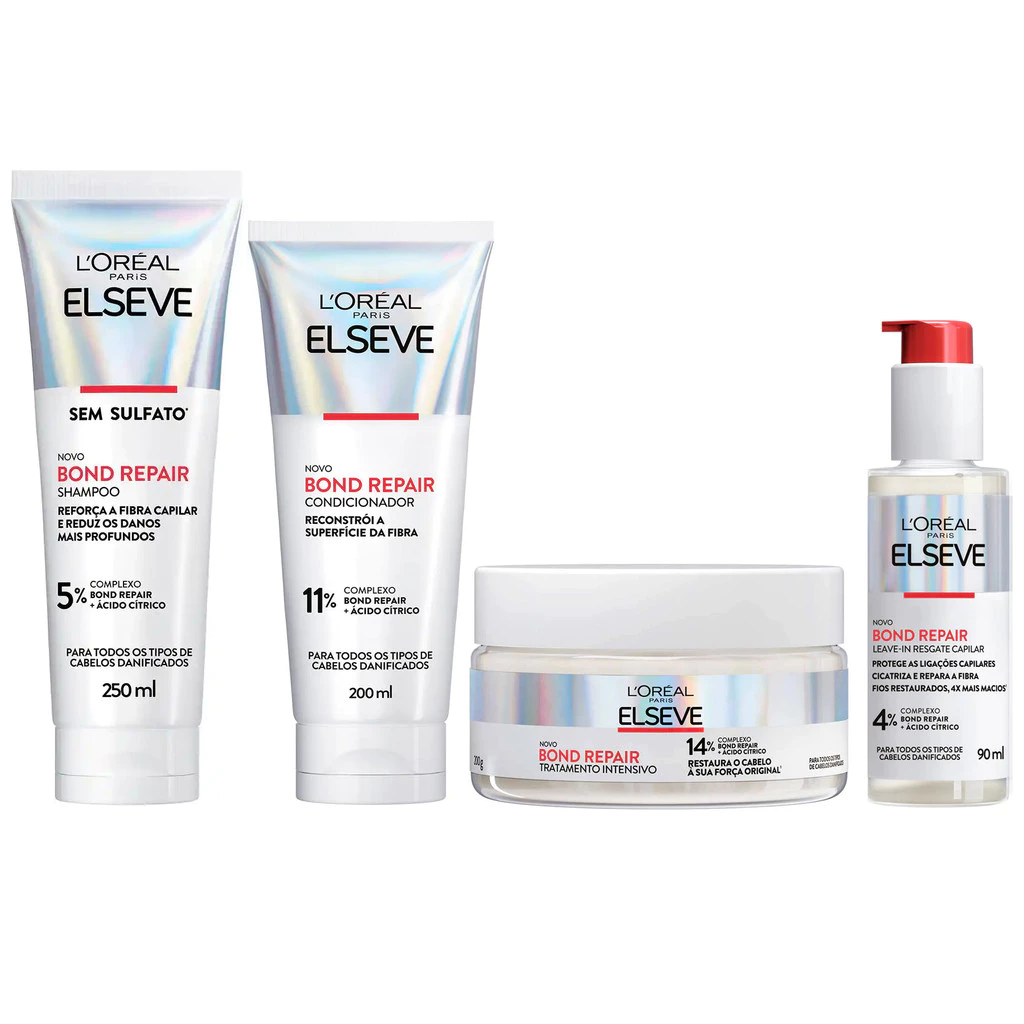 O Shampoo Elseve Bond Repair limpa, reforça a fibra capilar e reduz danos mais profundos. O tratamento intensivo é para uso após o shampoo para alcançar a reparação capilar mais profunda a nível molecular e completar a rotina Bond Repair. O Condicionador Elseve Bond Repair condiciona e reconstrói a superfície da fibra. O Leave-in Elseve L’Oréal Paris Bond Repair foi desenvolvido especialmente para cabelos danificados e enfraquecidos que necessitam de reconstrução profunda. Este tratamento sem enxágue atua na recuperação da fibra capilar a nível molecular, proporcionando resultados visíveis desde as primeiras aplicações.