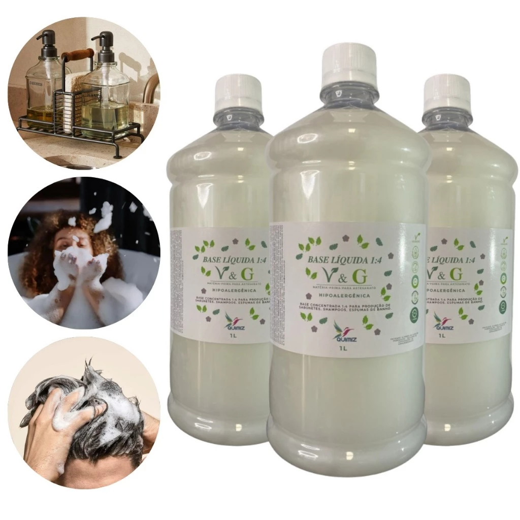 Diluir 1 parte da base V&G em 3 partes de água. Adicionar essência, extrato e corante conforme desejado. Se necessário, ajustar a viscosidade utilizando anfótero ou solução de cloreto de sódio. Sempre realizar um teste para conhecer melhor seu produto final.