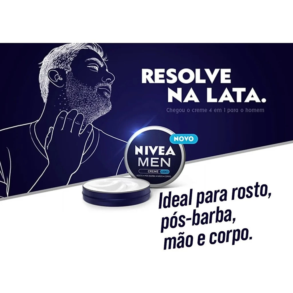 NIVEA MEN Creme 4 em 1, 30g: Um produto ideal para o rosto, mãos e corpo, podendo ainda ser usado como pós – barba*. Desenvolvido especialmente para os homens, NIVEA MEN creme 4 em 1 oferece hidratação e cuidado para a pele. A combinação NIVEA de Vitamina E e uma agradável fragrância. Fórmula leve, não oleosa e de rápida absorção. Dermatologicamente testado. **Pós-barba: teste de percepção de voluntários.