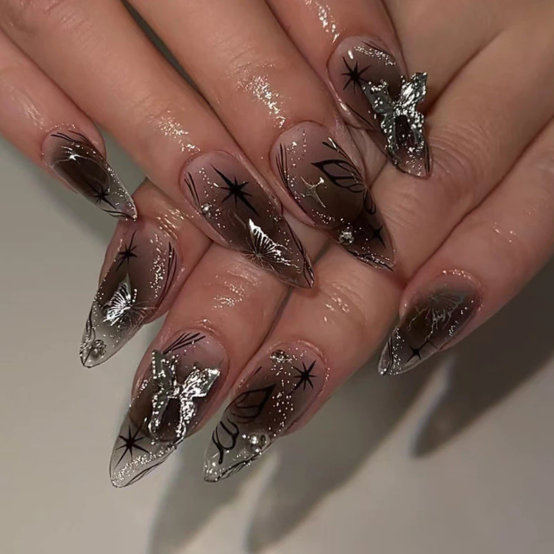 unha postiça realista pontiagudas Com Cola Borboleta Diamante Escuras Brilhantes kit unhas postiças decoradas Falsa